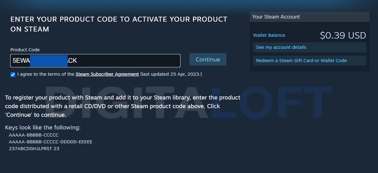 - في الصفحة الجديدة، أدخل مفتاح Steam في الحقل المخصص، ثم انقر على "متابعة".