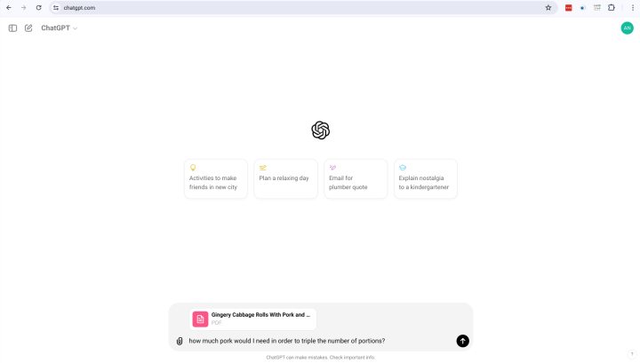 بمجرد إرفاق ملف PDF، يمكنك الآن كتابة استفسارك أو سؤالك في حقل إدخال النص. على سبيل المثال، إذا كنت تعمل على وصفة وتريد معرفة كمية مكون معين إذا أردت زيادة حجم الوجبة بمقدار ثلاثة أضعاف، يمكنك كتابة هذا السؤال في الحقل المخصص. بعد ذلك، انقر على زر السهم المتجه لأعلى لتحميل الملف والاستفسار إلى خوادم ChatGPT. انتظر قليلًا حتى يقوم النظام بتحليل الملف وتقديم الإجابة المطلوبة: